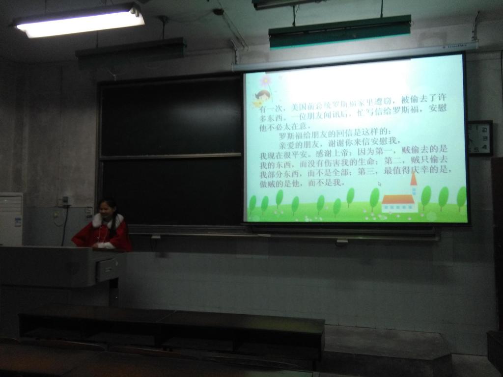 闻,用真切的爱把我们培养成人,我们必须铭记这份血浓于水的恩情。”同时,她还随机提问了几名同学一些问题,例如:“你父母的口头禅是什么?”、“父母的生日你还记得吗?”。这些简单的问题让在场的每一位同学都颇有感触。其后,她分别从老师,朋友,社会等方面全面的展示了感恩的理念,她希望同学们不要总是看到自己没有的,不要总是想着去抱怨,要学会看清身边所拥有的,那些才是每个人努力向上的源泉。