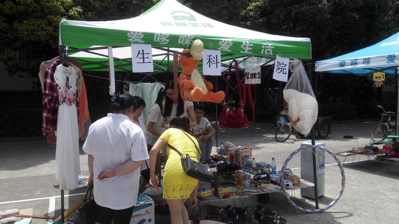 之前的一周生活部的干事们就已经对活动进行了详细的准备,收集了来自生科院毕业生们的许多物品,大到桌椅板凳轮滑鞋饮水机和玩具娃娃,小到戒指吊坠小公仔小钱袋。7点钟时公司的活动帐篷和待售物品都已就位,一位桃李园食堂的叔叔立刻买走了电风扇一个,这无疑是一个很良好的开端。后来天气渐渐炎热下来,客流量也在持续增加,但是这依然不会影响生活部同学们的热情,大家都忙着宣传、交易、记录,还要和来讨价还价的顾客们慢慢解释我们是在按照毕业生们的定价卖东西,并没有权利来降价。