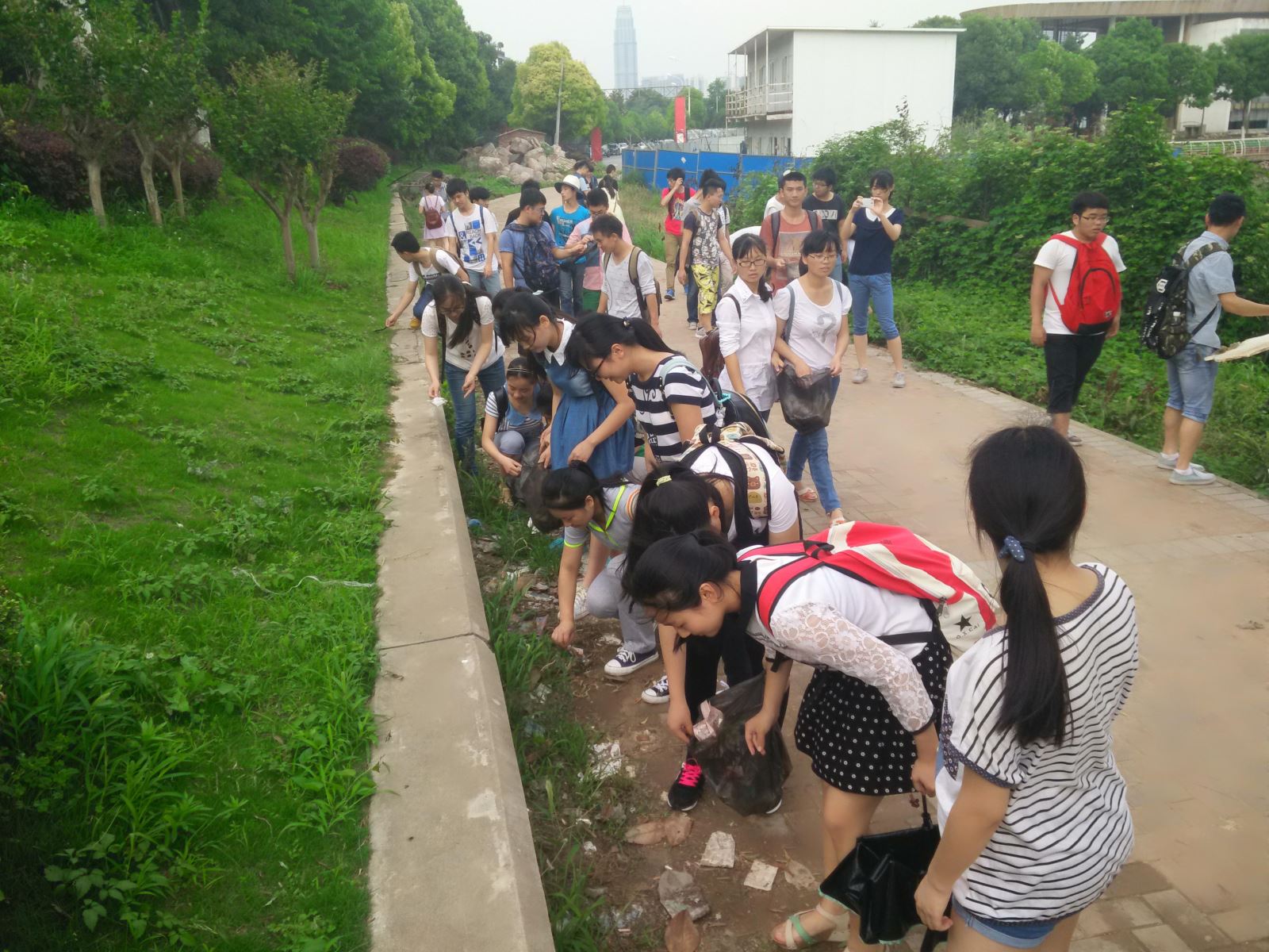 刚来到通往沙湖公园的那条小路上,同学们无不惊叹,波光粼粼的沙湖、随风飘扬的丝绦都是那么美,那么令人向往。但是,在感叹自然之美的同时,小路上那些随处可见的垃圾也无法令我们忽视。同学们按照寝室分为若干小组后,每个小组都被分配了指定的区域和垃圾袋,大家齐心协力、分工合作很快便将垃圾袋装满了,而那条起初堆满垃圾的小道也因我们的努力而展现出点点生机。