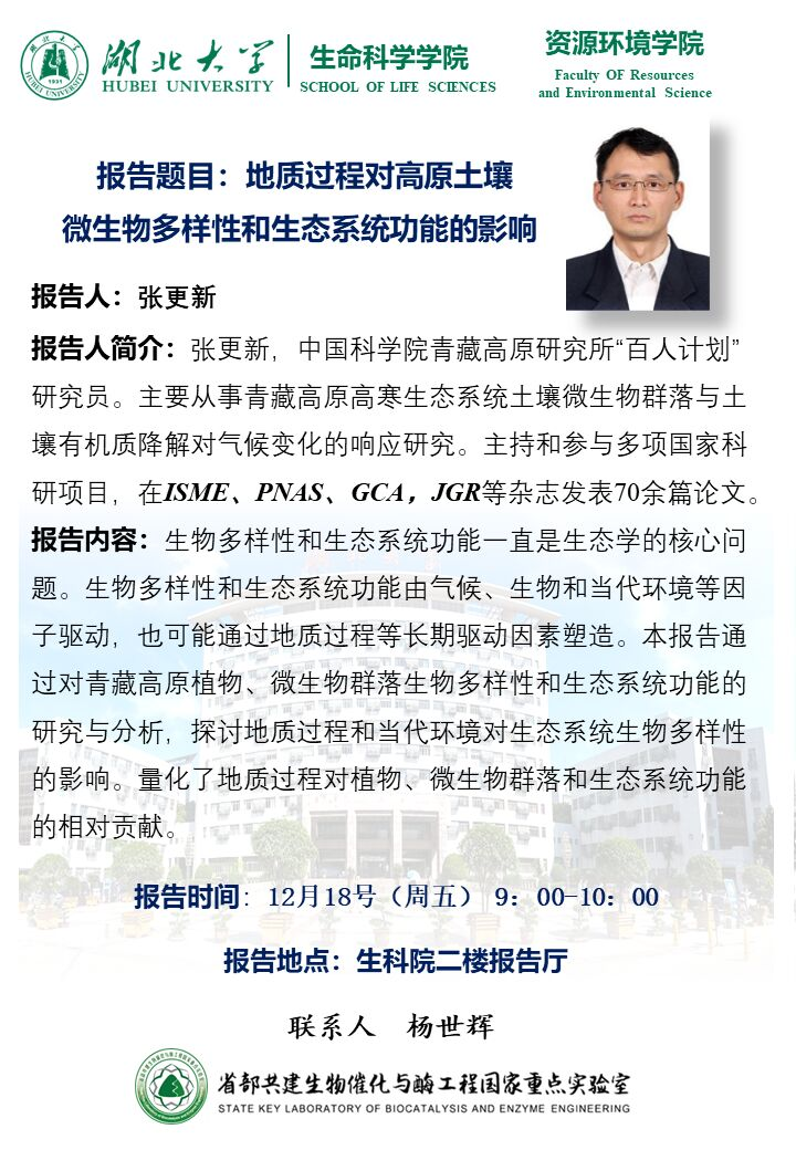 学术报告:地质过程对高原土壤微生物多样性和生态系统功能的影响