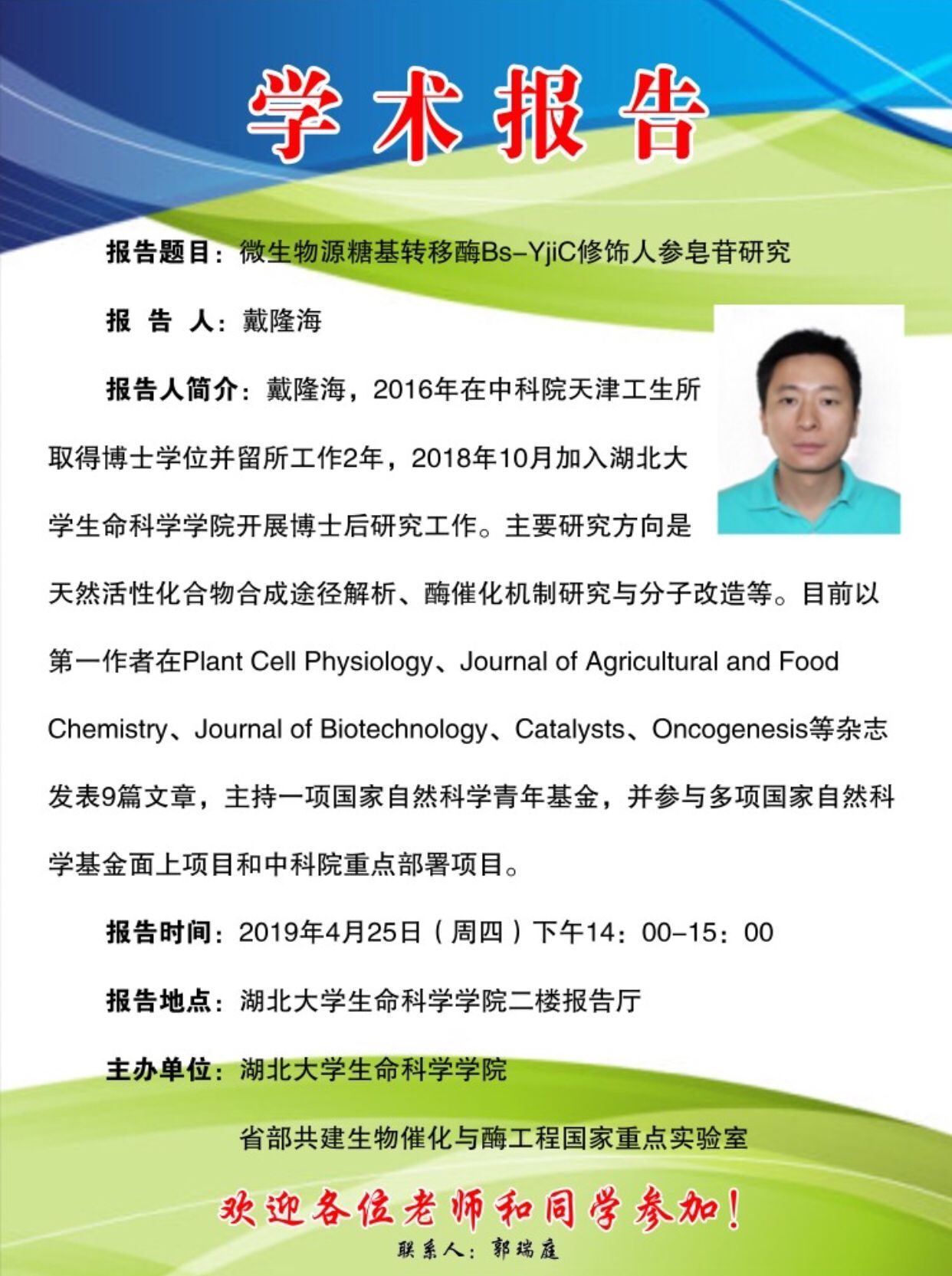 戴隆海,2016年在中科院天津工生所取得博士学位并留所工作2年,201810月加入william威廉亚洲开展博士后研究工作。主要研究方向是天然活性化合物合成途径解析、酶催化机制研究与分子改造等。目前以第一作者在Plant Cell PhysiologyJournal of Agricultural and Food ChemistryJournal of BiotechnologyCatalystsOncogenesis等杂志发表9篇文章,主持一项国家自然科学青年基金,并参与多项国家自然科学基金面上项目和中科院重点部署项目。
