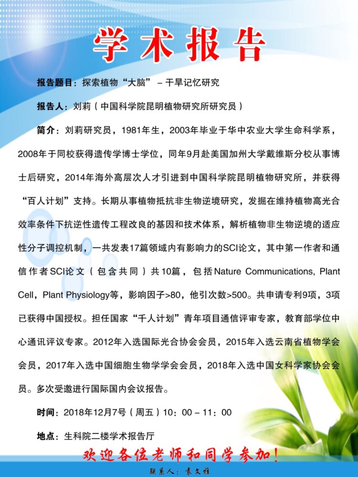 学术报告:探索植物“大脑” - 干旱记忆研究