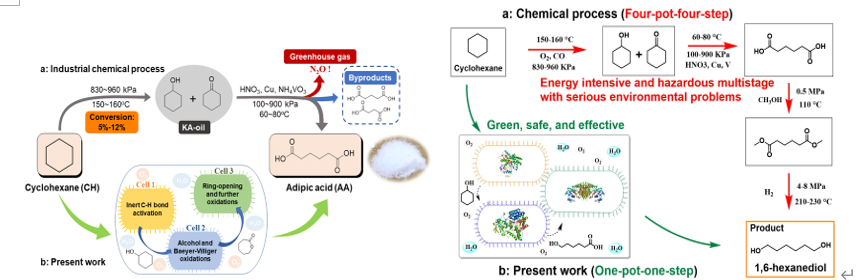 3. 人工生物合成途径的创制:提出基于自给自足的辅酶循环再生体系,利用大肠杆菌微生物组实现从环烷烃到α, ω-二元羧酸/二元醇的生物转化,实现了尼龙单体的绿色合成。团队设计了全新的酶法生物合成己二酸途径,变革性解决尼龙的绿色制造,有效解决了该行业80年污染的难题。