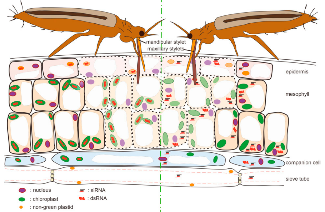4. 实现了质体介导RNAi对农业害虫桃蚜的有效防控,并且发现桃蚜存在一种灵活的避毒机制(Molecular Plant 2022)。
