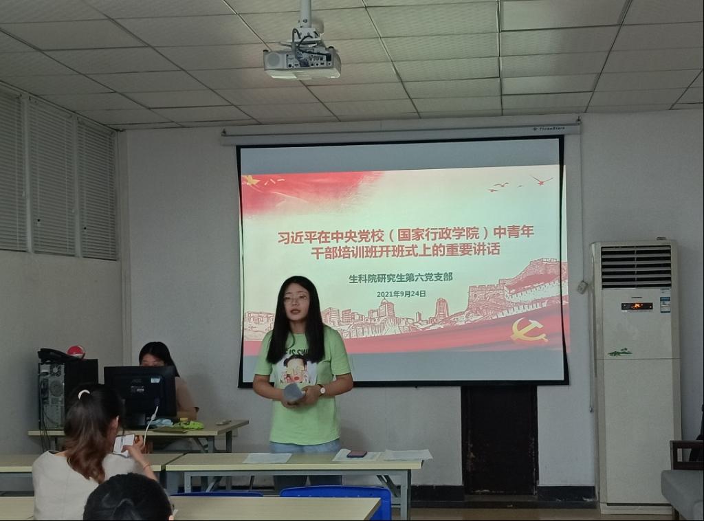 为持续推进党史学习教育走深走实,进一步激发党员的使命担当意识,2021年9月24日,我们党支部于生科院六报开展了学习“习近平在中央党校(国家行政公司)中青年干部培训班开班式上的重要讲话”主题党日活动。生科院研究生第六党支部全体党员参加了此次活动,本次活动由第六党支部书记张明佳主持。