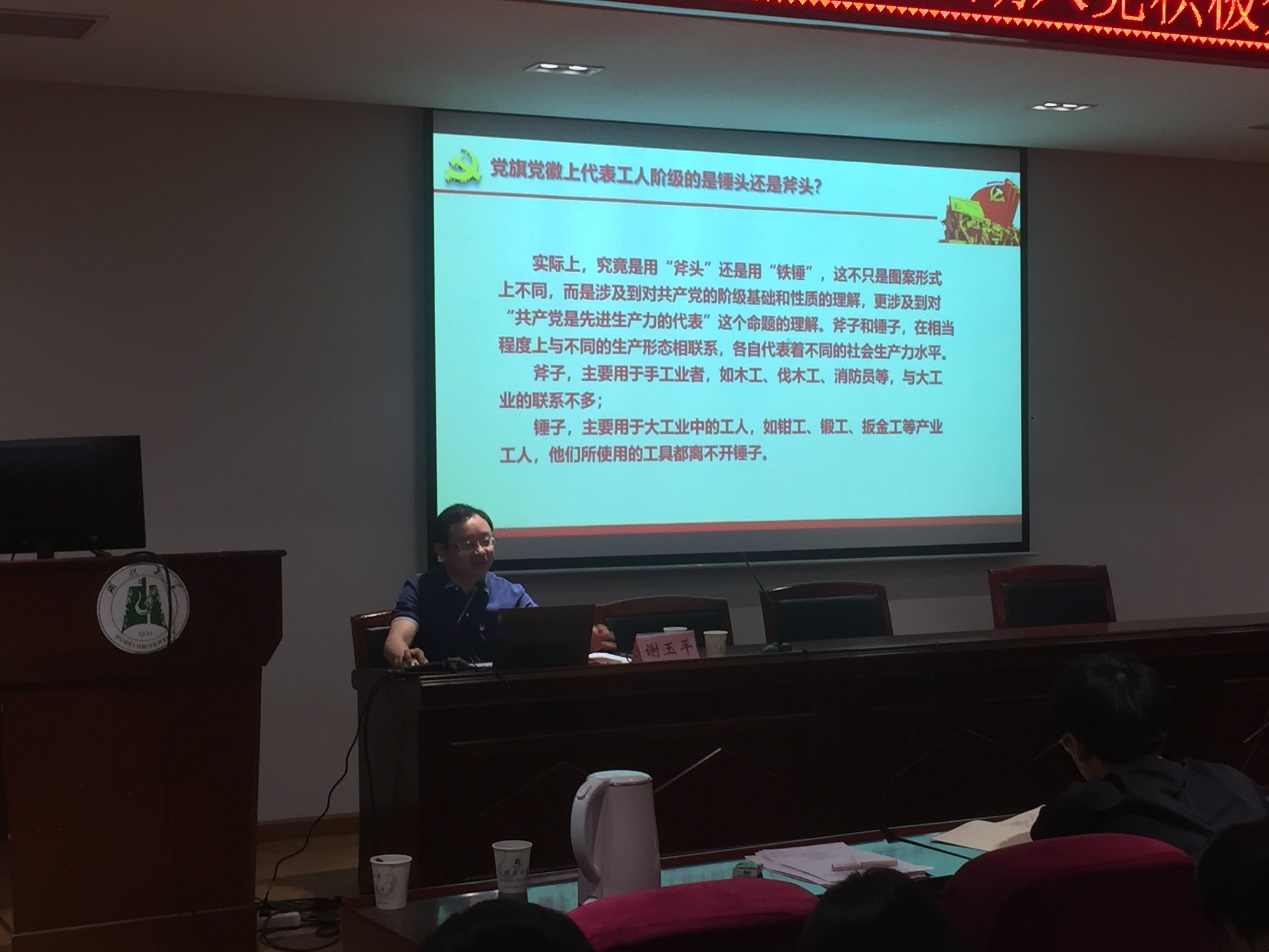 最后,报告回归到“共产党员”本身,谢书记讲解了党员徽章与党徽的区别,借此提醒同学们理解并注意党员徽章所代表的党员身份的意义,郑重对待党旗党徽,倡议同学们在党即将百年之际用心认真仰望党旗党徽,勉励同学们在日后牢记并践行党旗党徽下的誓言,成为一名在新世纪保持先进性的共产党人。