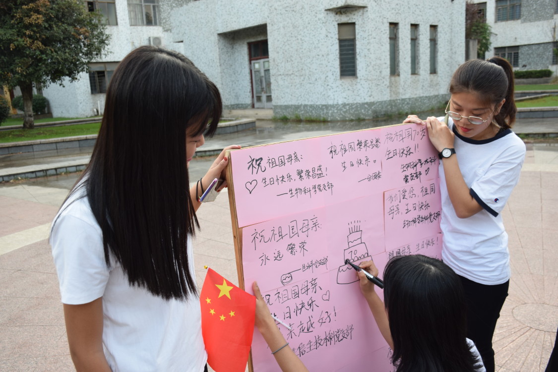 在合唱过后,员工党员为中华人民共和国成立70周年写下祝福语。“祝祖国母亲永远繁荣昌盛”,“祝祖国之树永远屹立不倒,生命之树繁华永驻”,“辉煌七十载,中国正青春”等祝福语书写着同学们对祖国母亲最直白的告白和最幸福的祝福。
